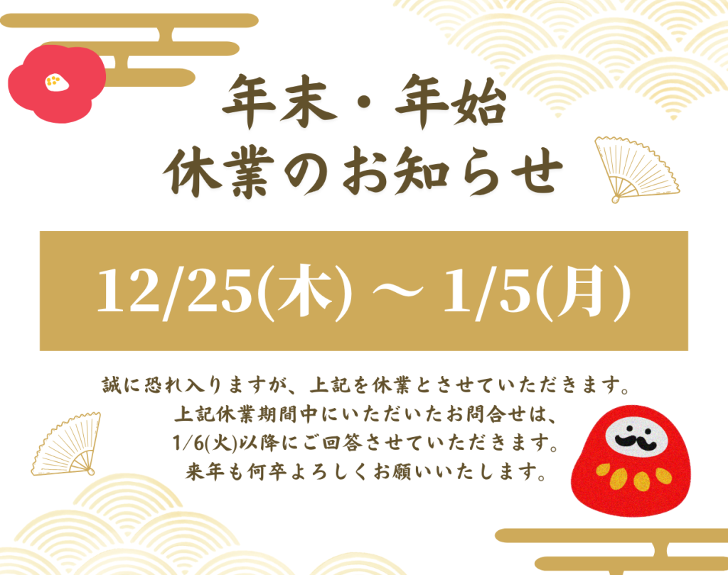 休業期間中も受付はしておりますが、資料発送・ご連絡は1月6日(火)以降となります。